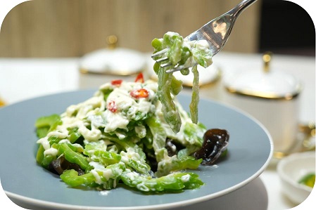 食評:杜阮涼瓜產(chǎn)自江門,因其瓜型平頂粒粗,粵語里也叫“雷公鑿”。適逢涼瓜當造,搭配木耳,混合青芥辣和沙拉醬來做涼拌,讓口感更富有層次,甘中帶甜之余,青芥辣也將自身辣味和食材的清爽帶入鼻中,正適宜清熱消暑。